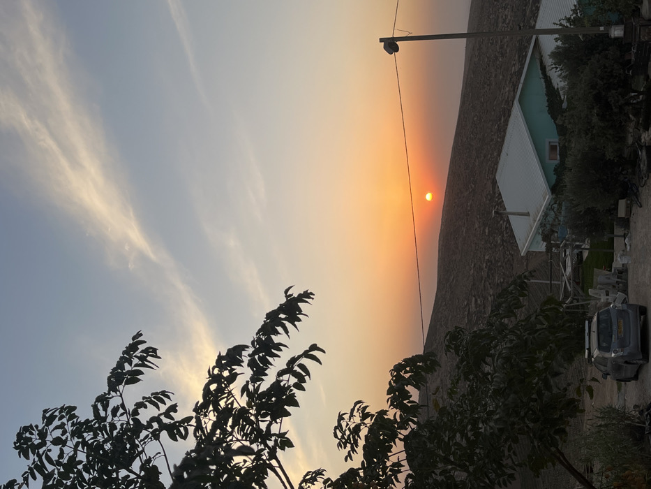 The image captures a sunset scene in the city of Unknown, Palestinian Territory. A vibrant orange sun is positioned low on the horizon, partially obscured by a dark, undulating hill that dominates the background. The sky graduates from a bright orange-yellow near the horizon to a pale blue at the top, streaked with thin, wispy white clouds. In the left foreground, the dark silhouette of tree branches and leaves fills a significant portion of the frame. Below these branches, a light gray compact SUV with a roof rack is parked on an unpaved, dirt-and-gravel surface. To the right of the vehicle, a single-story house is visible, featuring a light blue exterior and a white corrugated metal roof with a chimney. Several olive-like trees and bushes are situated in front of the house. A utility pole with an attached light fixture stands on the far right, from which a dark horizontal wire extends across the mid-ground, passing in front of the distant hill and the setting sun. No individuals are present in the scene.