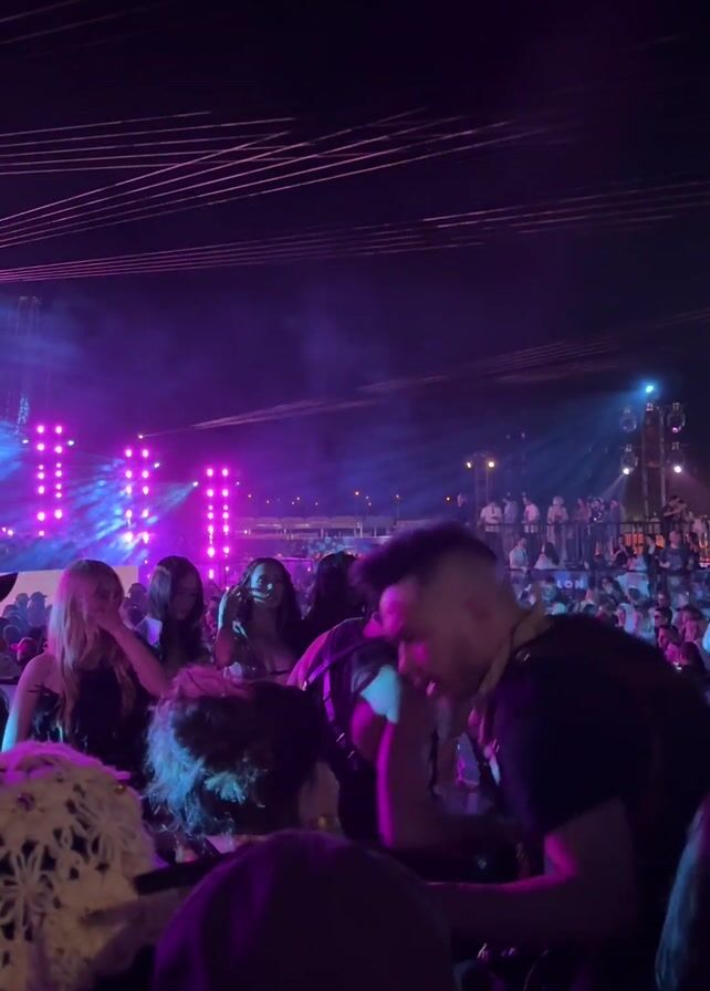 view of a concert crowd in the dark, lit with blue and purple stage lights. Several people are standing and dancing in the foreground, some facing the stage. One individual, wearing a black shirt, has a short haircut and what seems to be a photography rig on his body. He interacts briefly with someone to his right, before another individual in a hat and also wearing a photography rig comes into view. He carries a black bag with the word “Profoto” clearly visible. The crowd behind the immediate foreground dancers is dense, and more stage lights can be seen behind the crowd.