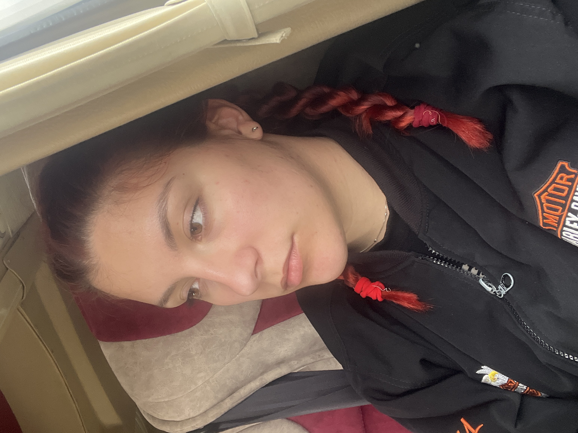 A young woman with reddish-brown hair styled in braids lies on a pillow. She is wearing a black jacket with a Harley-Davidson logo on the upper right sleeve. The background suggests an indoor setting with a window covered by a beige-colored curtain. The location in the city of Kalugerovo, Bulgaria is not discernable from the visual information provided.