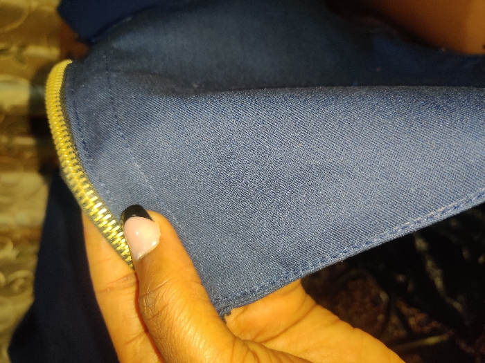 A close-up image depicts a person's hand holding a piece of dark blue fabric with a golden zipper in New Stadium, Nigeria. The hand, with a dark skin tone, displays an index finger with a manicured nail featuring a light pink base and a black tip. The fabric exhibits a twill weave texture and includes visible stitching along an edge. A metallic golden zipper, partially open, is integrated into the fabric along a horizontal seam in the upper portion of the frame. The background is out of focus and dark, providing no discernible environmental details.