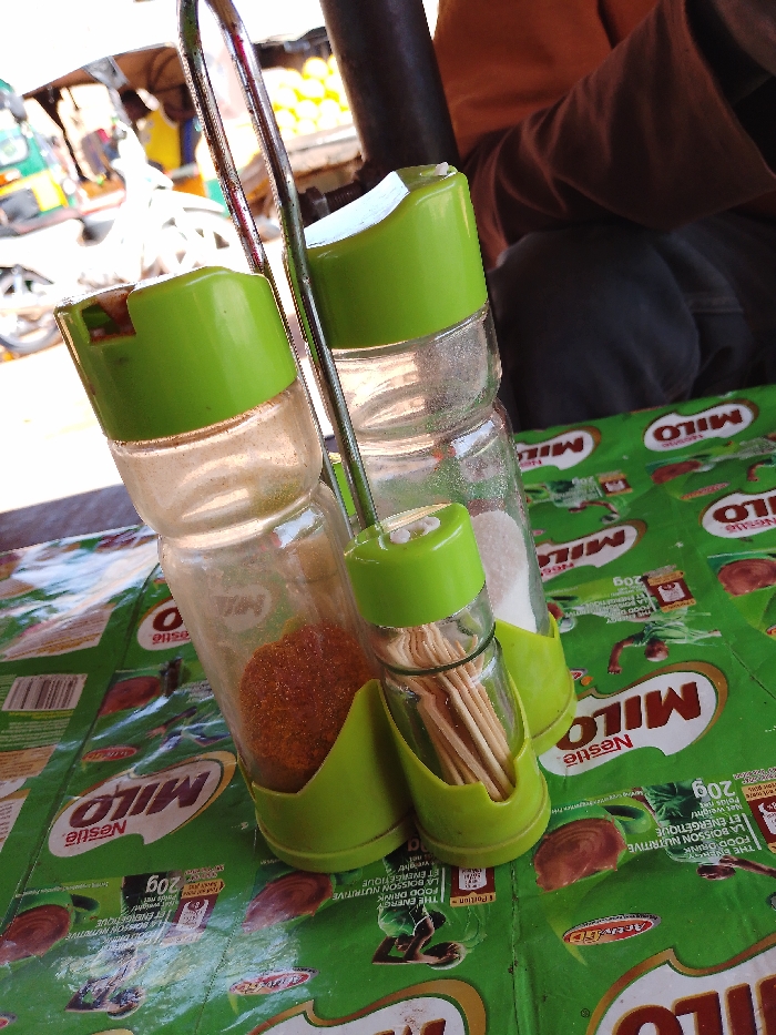 A green plastic spice caddy with a chrome handle occupies the foreground, holding three clear glass shakers with matching green caps. The leftmost shaker contains a quantity of red ground spice, likely chili. The central, smaller shaker contains numerous wooden toothpicks. The rightmost shaker holds a white granular substance, consistent with salt. This caddy rests on a surface covered with flattened, interconnected green Milo beverage packaging, serving as a makeshift tablecloth. The "Milo" logo and product information are clearly visible on the wrappers. In the blurred midground to the right, a person is partially visible, wearing an orange or brown long-sleeved garment and dark trousers, appearing to be seated or squatting. The blurred background to the left reveals a white vehicle, possibly a motorcycle or a Keke Napep (tricycle), and further back, indistinct yellow objects, suggesting produce at an outdoor market or roadside stall in Gura Top, Nigeria.