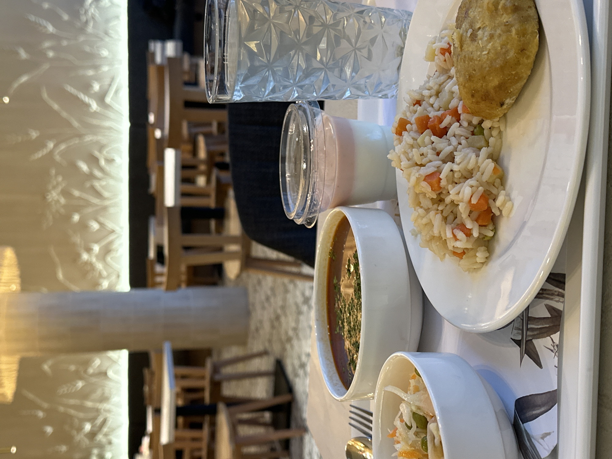 A close-up image depicts a tray holding a prepared meal in a dining facility located in Polje, Montenegro. On the white rectangular tray, from left to right, are: a small white ceramic bowl containing a salad of shredded cabbage, diced carrots, and green peas; a larger white ceramic bowl holding a reddish-brown soup garnished with chopped green herbs; a clear plastic cup with a lid containing a two-layered dessert (white bottom, light pink top); and a tall, clear glass with a faceted geometric pattern, filled with a clear liquid. A white ceramic plate holds a portion of rice pilaf mixed with diced carrots and green peas, alongside a single golden-brown, disc-shaped pastry or fried item. A silver spoon and fork are partially visible to the left of the soup bowl. The tray rests on a surface with a printed paper placemat featuring a bird illustration. The background shows a brightly lit, modern cafeteria or restaurant setting with numerous empty wooden tables and chairs. A large, light-colored cylindrical pillar is centrally located in the mid-ground. The walls feature illuminated decorative panels with stylized white botanical patterns, resembling wheat stalks. The floor exhibits a patterned tile design. No individuals are visible in the scene.
