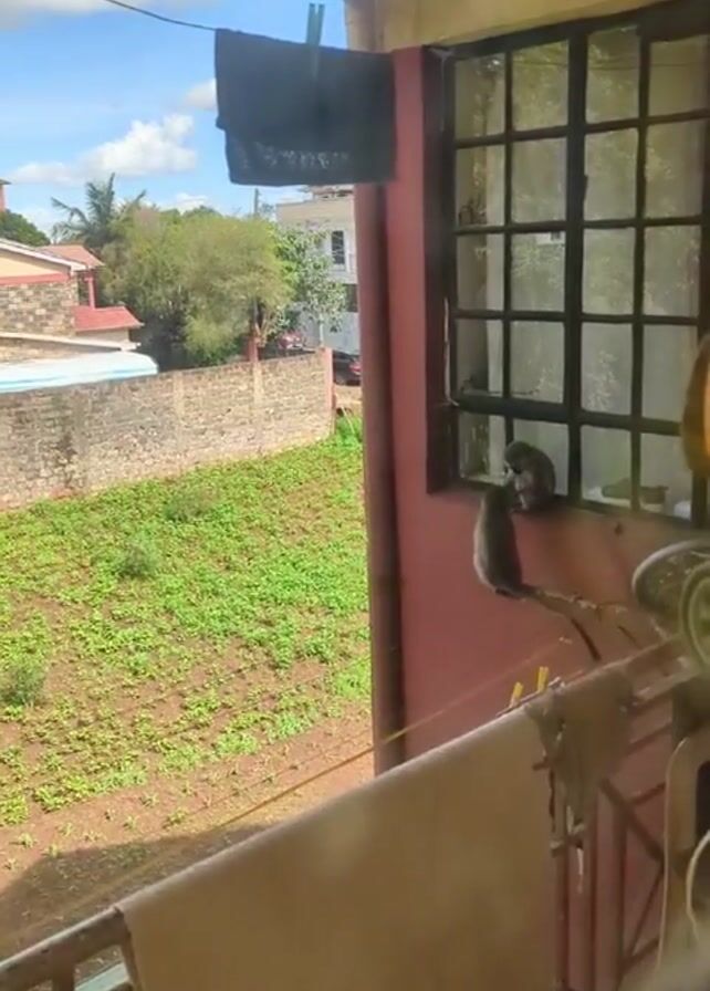 From a balcony perspective, two monkeys are seen near a window of a red building. The smaller monkey is perched on the window frame while the other sits below it on a ledge. A clothesline hangs with items drying, and below the building is a plot of land with greenery. The sky is visible above the buildings and trees in the background, with scattered clouds.