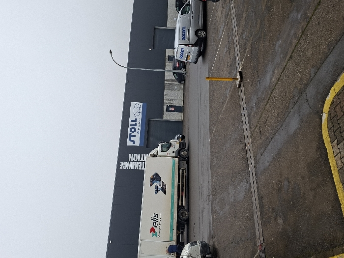 This image depicts an outdoor industrial or commercial scene in Leudelange, Luxembourg, under an overcast sky. The foreground features an asphalt parking area, which appears damp in patches. A yellow painted curbstone is visible in the bottom left. Two parallel linear features, possibly expansion joints or drainage gratings, traverse the mid-ground pavement. A yellow vertical bollard is positioned on a concrete base in the mid-right foreground. In the background, a large, dark grey industrial building spans the width of the frame. Prominent white signage on the building reads "STOLL" with a stylized couch icon beneath it, followed by "Mobilier Büromöbel". To the left of "STOLL", vertical white text reads "MAINTENANCE REPARATION". The building features multiple dark grey roll-up garage doors and smaller entry doors. A black street light pole with a curved arm extends upwards in front of the building. Vehicles present include: 1. A white box truck, positioned in the mid-left, with "Elis" branding in green, the slogan "We take care. It's good for business.", and a graphic of industrial laundry equipment. The truck appears stationary. A partially visible individual is near the driver's side of this truck. 2. A silver van, branded with "socom" on its side, is parked in the mid-right. Its rear passenger-side door is open. 3. A partially visible white vehicle is in the immediate foreground, left of the Elis truck. 4. Several dark-colored vehicles are visible parked or in motion in the background, closer to the building.