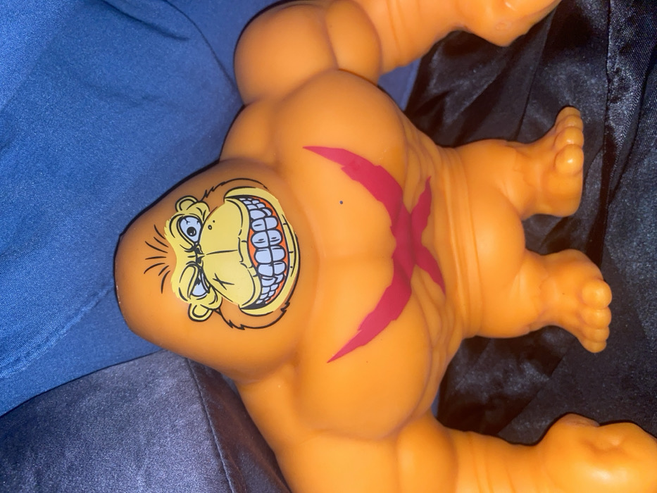 An orange, muscular toy lies diagonally. It has a cartoonish ape face with a wide, toothy grin. On its back is a red "X" symbol. The toy has prominent muscles and small feet. It is on top of blue denim and black fabric. The lighting is soft, highlighting the toy's texture.