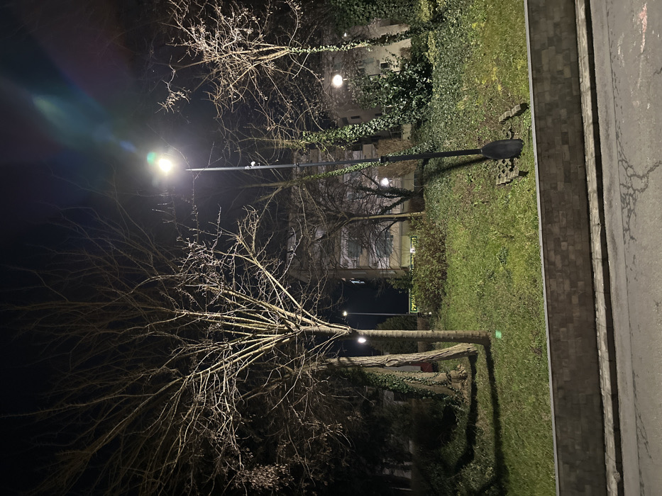 The image depicts an outdoor night scene in Nesebar, Bulgaria, focusing on a public green space adjacent to a street. The dark, clear sky indicates nighttime conditions, with the environment illuminated by artificial light sources. In the foreground, a paved asphalt street with subtle markings runs horizontally across the bottom of the frame, bordered by a concrete curb. Above the curb, a low retaining wall constructed from light-colored bricks separates the street from an elevated grassy slope. The grass on this incline appears somewhat patchy and mixed with areas of bare earth and sparse, low-lying reddish vegetation. The mid-ground is dominated by a prominent, operational streetlamp with a bright, greenish-white LED light source, positioned slightly right of the image center. This lamp casts a distinct, elongated shadow across the grassy slope to its left. Lens flare, originating from the primary light source, is visible extending upwards and to the right. The streetlamp's base is secured by a structure composed of concrete blocks. To the left of this main lamp, a second, dark-colored streetlamp post stands without a visible light fixture at its top. Numerous deciduous trees, primarily bare of leaves, are scattered throughout the green space, indicating a winter or early spring season. Their skeletal branches are illuminated by the ambient light. A large, centrally located tree exhibits multiple upward-reaching trunks and a dense network of bare branches. Other trees, particularly on the right side of the image, are partially covered in dark green ivy. In the background, behind the trees and green areas, multi-story buildings are visible. These structures show illuminated windows or internal lighting. A partially visible green sign with white Cyrillic text, which appears to read "РЫБА МЕ..." (Ryba Me...), is situated on the left side of the background, near one of the buildings. No individuals, animals, or active subjects are present in the scene.