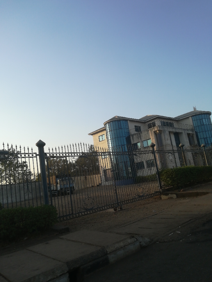 The image depicts an outdoor scene in the city of Unknown, Unknown, captured during daylight hours with a clear, light blue sky. In the foreground, a dark paved road surface transitions to concrete sidewalk slabs on the right, which appear somewhat uneven. Beyond the sidewalk, a dirt and gravel patch fronts a dark, ornate metal fence featuring pointed finials and decorative scrollwork. Low green hedges are visible along the base of the fence. Behind the fence, a multi-story building with a light-colored, possibly beige, facade is the primary structure. It features two prominent rounded sections on its left and right sides, each equipped with large, curved blue-tinted glass windows. Rectangular windows are also visible across the building. Portions of the building's exterior show weathering or discoloration. To the left, behind the fence, trees with sparse foliage are visible. A light-colored utility truck, possibly white with a blue cabin, is partially parked on a dirt area behind the fence, visible through the gate to the left of the building's center. No individuals or specific actions are depicted. The scene is evenly lit by natural sunlight, suggesting a clear morning or late afternoon.