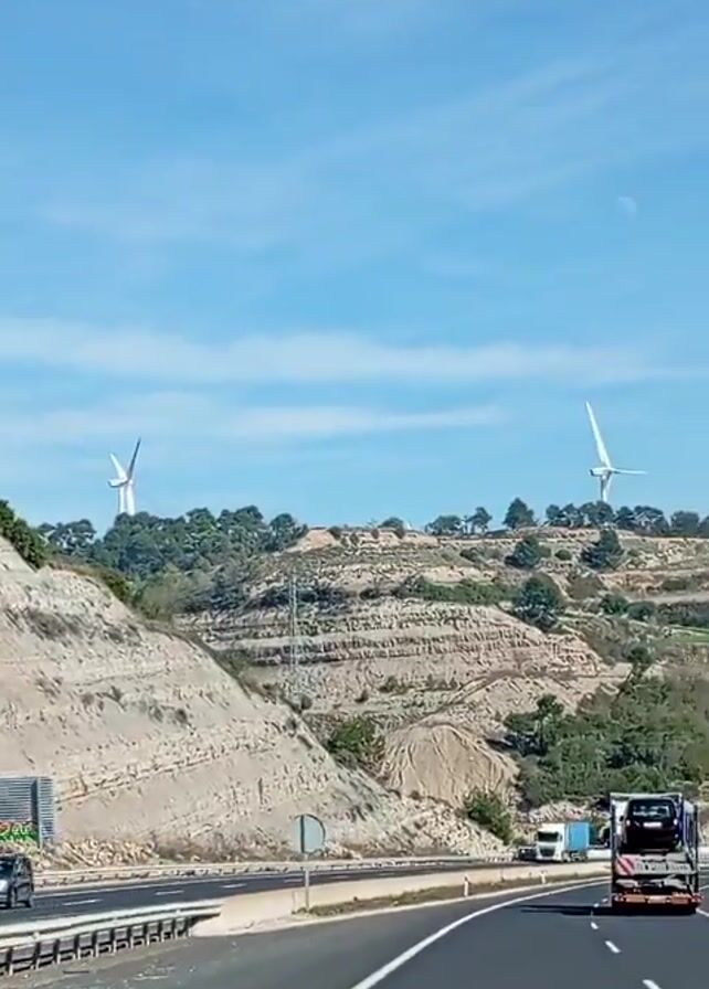 highway driving scene. The road is mostly straight with some gentle curves. The landscape features hills with layered rock formations and wind turbines in the background. Cars and trucks are visible on the highway, moving in both directions. The sky is clear with a few wispy clouds.