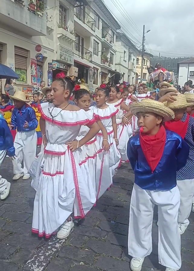 A group of children are dancing in a parade on a street with buildings on both sides. The children are dressed in traditional costumes. The girls wear white dresses with red trim, and the boys wear blue jackets, white pants, and straw hats. Some of the boys wear red neckerchiefs. The children are dancing in unison, moving their arms and legs in a coordinated manner. Some of the children are blowing whistles. Spectators line the street, watching the parade. The street is paved with cobblestones. A Coca-Cola sign is visible on one of the buildings.
