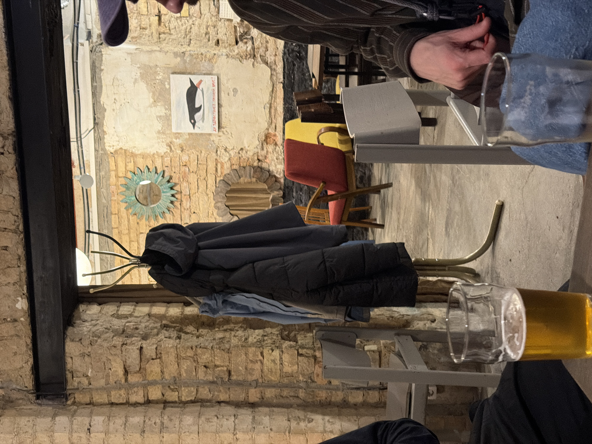 The image depicts an indoor scene within a casual establishment in Hrodna, Belarus, characterized by exposed brick walls and a rustic aesthetic. In the foreground on the left, a glass containing amber liquid, consistent with beer, sits on a dark wooden table. A person's arm, dressed in a dark garment, is partially visible beside it. On the right, another person is partially visible, wearing a dark brown striped shirt and a purple baseball cap. Their right hand, with a visible red object, rests on a light blue fabric surface, in front of which is a clear glass. The midground features a brass-colored coat rack laden with multiple jackets, including a dark blue hooded jacket, a lighter blue garment, and a black puffer jacket. Behind the coat rack, a room extends with textured exposed brick walls partially covered by peeling light-colored plaster. A prominent horizontal black beam crosses the upper frame. On the left wall, a green, sunburst-shaped mirror is mounted, with another oval mirror below it. A white rectangular painting on the far wall displays a black penguin with red extremities, and Cyrillic text visible beneath it, translating to "LONG LIVE THE PROFIT." Two armchairs, one red and one yellow, both with wooden frames, are visible further into the room, alongside dark wooden tables and chairs in the background. The floor appears to be concrete. The lighting is dim and warm, contributing to a relaxed ambiance.