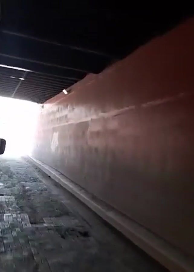 view from the side of a moving vehicle as it exits a dark tunnel into bright daylight. Initially, the tunnel walls are a dark reddish-brown color. As the vehicle emerges, the walls transition to a brighter red with horizontal blue and green stripes. Above the wall, buildings under construction and billboards can be seen. The vehicle continues to move forward along what appears to be a street, with the red wall on one side. The overall atmosphere suggests an urban setting.