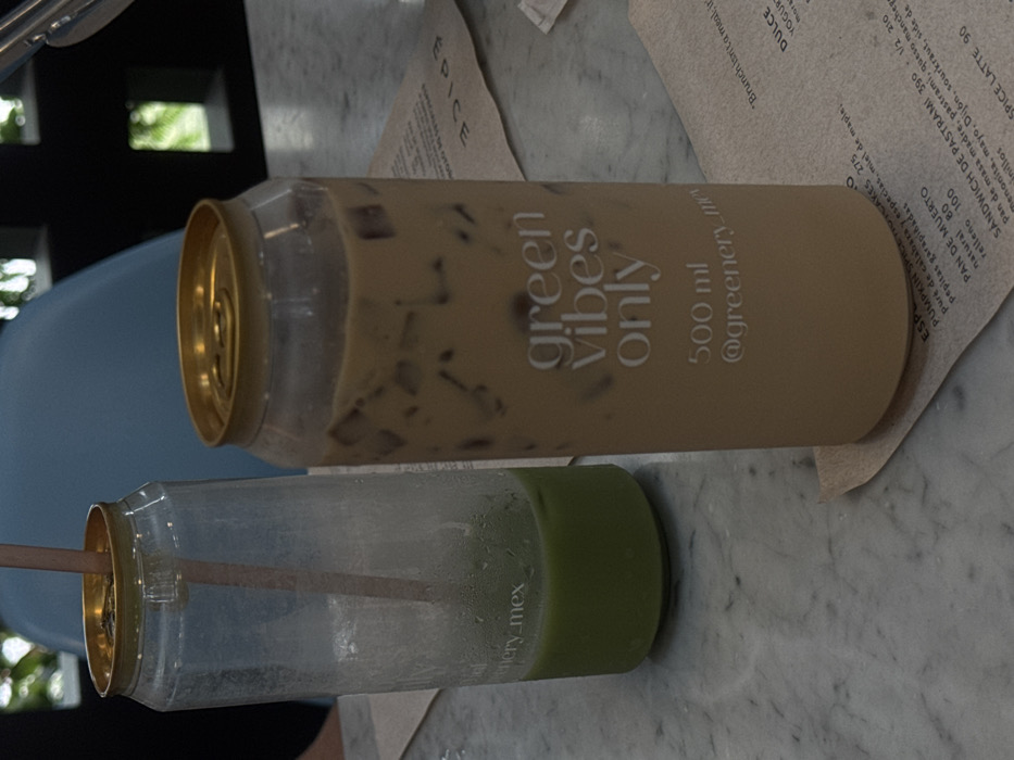 Two clear plastic beverage containers, designed to resemble soda cans with golden pull-tab lids, are positioned on a polished, light-colored marble or stone table. The container on the right holds an iced, milky, light brown beverage with "green vibes only," "500 ml," and "@greenery_mex" printed vertically in white text. The container on the left contains a dark green liquid, partially consumed, with external condensation; a light brown straw extends from its golden lid. Both containers rest on light brown paper placemats, one of which functions as a menu displaying Spanish text with items such as "PUMPKIN SPICE HOTCAKES," "PAN DE MUERTO," and "SANDWICH DE PASTRAMI." The background is out of focus, showing a blue chair and indistinct green foliage visible through dark-framed openings, suggesting an indoor cafe or restaurant setting in Mexico City, Mexico. No individuals are visible within the frame.