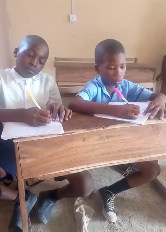 Two young boys are sitting side by side at a wooden desk in what appears to be a classroom setting