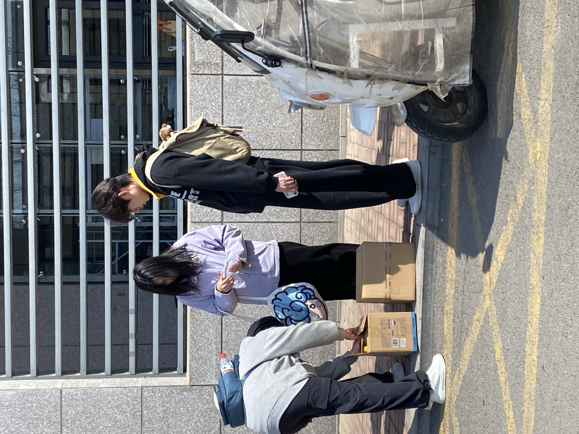 Three individuals are near a building with barred windows. The first individual is in a black jacket and pants with a khaki backpack. The second is wearing a light purple jacket and black pants. The third is wearing a gray hoodie, black pants, and a backpack, near two cardboard boxes. The environment is likely outdoors on a paved area. A three-wheeled vehicle is to the upper-right of the first individual. This scene is set in Zhongtun, China.