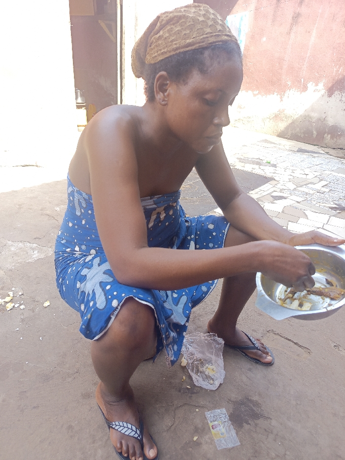 An adult female is depicted squatting on a rough, reddish-brown ground surface in an outdoor setting in Doma, Nigeria