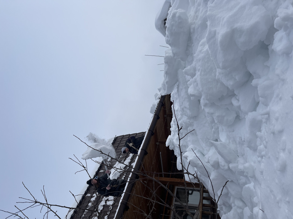 The image depicts a winter scene in Italmas, Russia. Two individuals are actively engaged in snow removal from the dark, sloped roof of a building. The person on the left is captured mid-action, propelling a large quantity of snow off the roof with a shovel, creating an airborne plume. The second person, positioned to the right on the roof, is also holding a shovel. The building features a visible brown wooden eave and a gutter system. Below the roofline and extending into the foreground, extensive, disturbed snow accumulates in large, irregular piles. Bare tree branches are visible in the immediate foreground, partially obscuring the lower structure of the building. The sky is uniformly overcast.