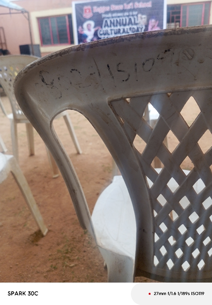 The image captures an outdoor scene at the Reggae Store International School in Kakau, Nigeria. In the immediate foreground, the back of a worn, off-white plastic chair is prominently displayed, featuring black handwritten text "GOOD IS 1510C" along its top edge. The chair's backrest exhibits a diamond lattice pattern on the right and a plain curved support on the left. The ground is reddish-brown earth with sparse patches of green vegetation. In the midground, several other similar white chairs are visible, out of focus. The background reveals a light-colored building facade with a window featuring red bars. A large banner hangs against the building, displaying the text "Reggae Store Intl School" and "ANNUAL CULTURAL DAY," accompanied by a red logo and blurred illustrations of figures. A dark, box-like object, possibly a speaker, is situated to the left of the banner. No individuals are present in the scene.