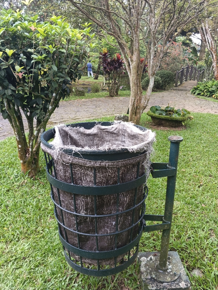 A metal trash can with a tattered liner sits on a concrete base in a grassy park. The can is dark green, cylindrical, and has a metal grid surrounding the interior. A matching metal pole secures the can to the base. Behind the trash can, there is a tree, a paved path, and a small bridge in the distance. A figure in blue is visible on the path. The surroundings are lush with greenery and various plants.