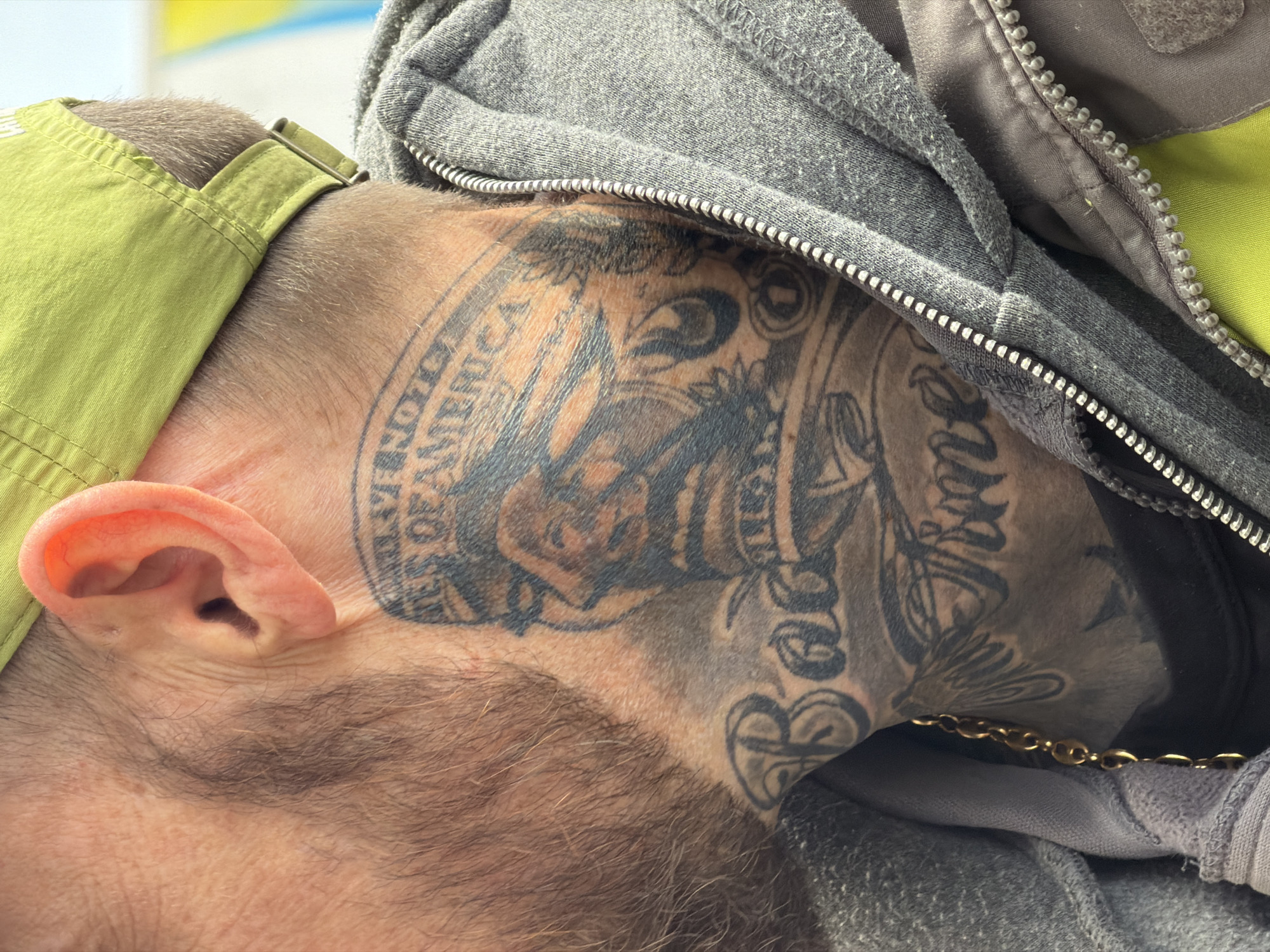 A close-up, profile view captures the right side of an individual's head, neck, and upper torso in Leudelange, Luxembourg. The subject is an adult male with short brown hair visible at the nape of the neck and a light brown stubble beard on the right cheek and jawline. He wears a light olive green baseball cap, a grey hooded sweatshirt with a silver zipper partially open, and a darker grey/brown outer jacket, also partially unzipped, revealing a neon yellow/green inner lining and a black undershirt. A gold-colored chain with oval links is visible around the neck. The right side of the neck is extensively tattooed with black ink. Prominent designs include an image resembling a Native American chief wearing a headdress, with partially legible text above it, including "...ES OF AMERICA". Below this, a banner-like design features the script "Bad Times". Additional intricate patterns, suggestive of feathers or flames, are present among the tattoo work. The background is blurred and out of focus, providing no specific environmental details beyond indistinct light and color. No active interactions or specific actions are depicted.
