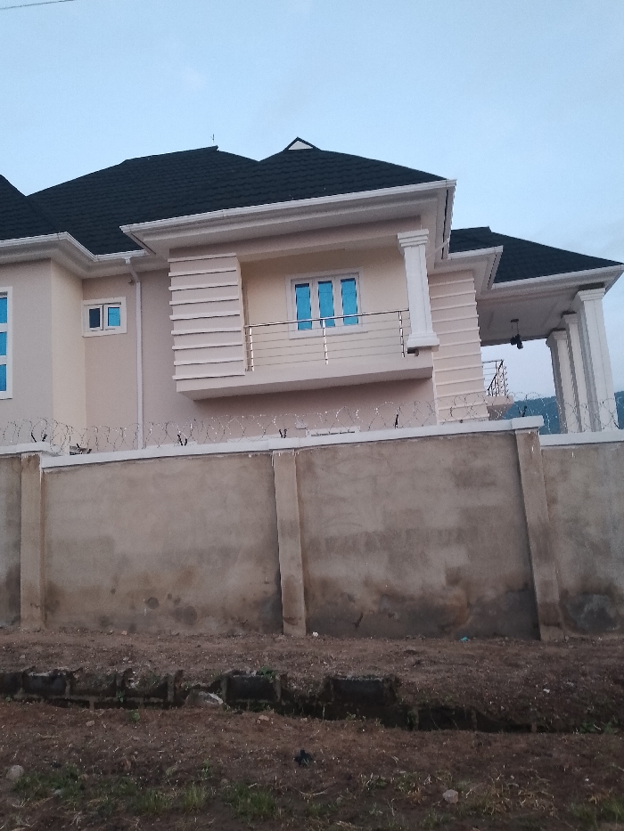 The image displays the exterior of a two-story residential building located in Lokoja, Nigeria