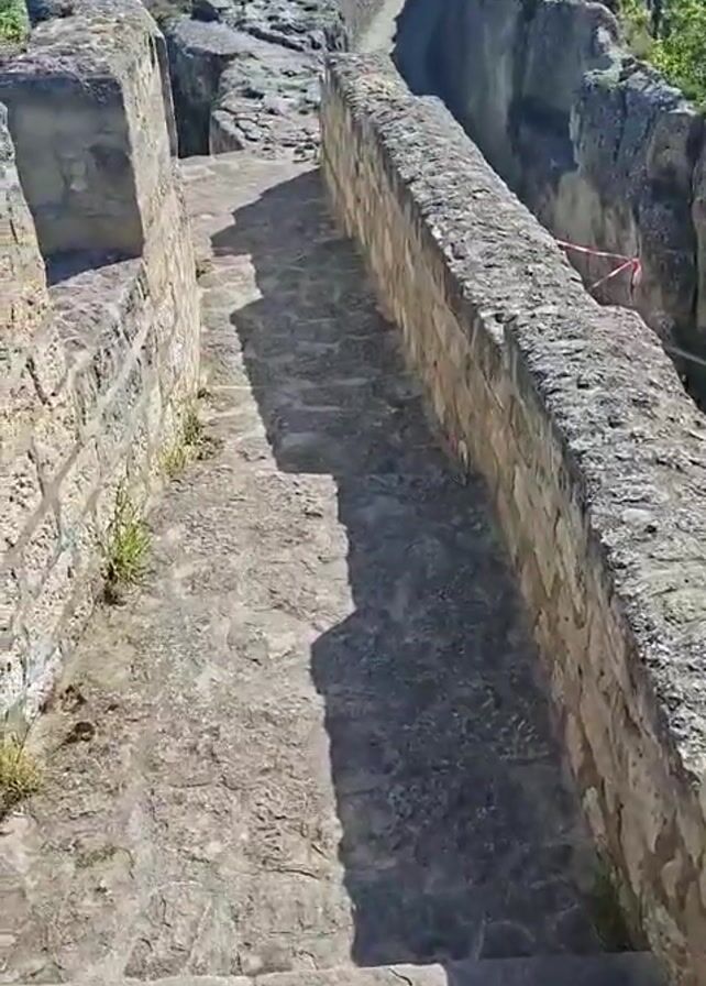 person walking up a set of stone stairs along an old stone wall. At the top of the stairs, the person is standing on top of the wall with a view of a field with the Bulgarian flag flying in the distance. There are a few other people in the distance on the field and more trees and foliage beyond. The day is sunny with a clear blue sky.