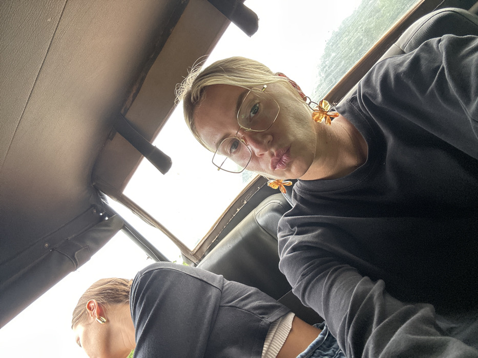 Two women in a vehicle are captured in a low-angle selfie. The woman in the foreground has blonde hair, glasses, and flower-shaped earrings, puckering her lips toward the camera. The other woman, with her head down, wears a grey top and has short brown hair. The vehicle's interior, including the roof, window, and seat, is visible. The background shows a blurred outdoor scene with overcast lighting.