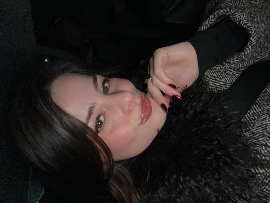 A woman with brown hair and eyes gazes at the camera. She wears dark nail polish, a ring on her finger, and a coat with a dark, furry collar. A portion of what appears to be a herringbone-patterned coat is also visible. The background is dark, providing contrast to the woman's face. The image is slightly rotated.