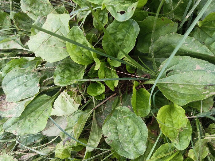 - "The image displays a close-up view of a dense patch of broadleaf plantain (Plantago major) and interspersed grasses, located on a patch of ground in Pinnwe, Myanmar (Burma)" by FM-hzwcH2, licensed under CC BY 4.0