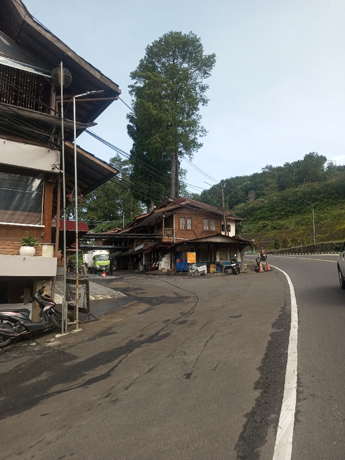The image depicts an outdoor scene at a street intersection or curve in what is identified as the city of Thanthirimale, Sri Lanka. The primary road, made of asphalt with visible tire marks and stains, curves sharply to the right in the foreground and mid-ground, featuring a solid white lane divider on its right edge. On the left side of the scene, a multi-story building with a brown and white facade is partially visible. It features an ornate metal balcony railing on an upper level and large windows. A white pot containing a green plant rests on a ledge on the building's lower section. A dark-colored scooter or motorcycle is parked near the base of this building. Utility poles with multiple overhead wires crisscross the frame from the left. Further into the mid-ground, a row of buildings with predominantly wooden exteriors and sloped roofs lines the road. A prominent light brown wooden building with two stories and multiple windows stands out. To its right, a smaller, single-story kiosk-like structure with a corrugated metal roof and a "SNACK" sign is present, with blue tarps visible nearby. A dark-colored motorcycle is parked adjacent to this kiosk. In the background, a very tall, slender tree with dense green foliage stands prominently, towering over the buildings. Beyond the road on the right, a densely forested hillside with various green trees and bushes extends upwards, suggesting a hilly or mountainous terrain. A street light pole is visible on this side of the road. Two individuals are discernible near two orange traffic cones positioned on the right shoulder of the road curve; one appears to be standing near a motorcycle. Another individual is partially visible further back on the left, near a light green box truck that is parked or idling under an overhang. A white car is partially visible on the far right edge of the main road, facing away from the viewer. A partially obscured sign reading "TUTUP P" is visible near a gate or barrier in the mid-left. The sky overhead is a clear, light blue.