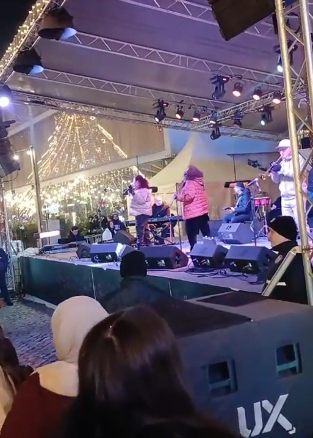 The scene captures a live band performing on a stage at an outdoor event at night. Two female vocalists, one in a pink jacket and another in a beige jacket, are at the front of the stage, singing into microphones. They are accompanied by musicians playing instruments like keyboard, drums, and what appears to be a violin or viola. The stage is lit up with various colored stage lights and has large speakers positioned nearby. A translucent covering protects the stage from above, and string lights provide a festive touch to the structure. In the background, there's a tall tree adorned with lights, adding to the festive atmosphere. A crowd is gathered in front of the stage, watching the performance. Security personnel can be seen near the stage, monitoring the event. The audience consists of individuals wearing winter clothing, including hooded jackets and hats, indicating a cool weather setting.