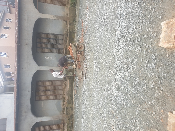 The image captures an outdoor scene in Aba, Nigeria, depicting two adult males engaged in material handling. The ground surface is covered with light grey and white gravel. In the center, a brown, single-wheeled wheelbarrow is partially filled with reddish-brown aggregate material, with some spillage around its base. The male on the left, wearing a light-colored patterned shirt, dark shorts, and rubber boots, stands with his left leg bent, leaning towards the wheelbarrow. The male on the right, dressed in dark clothing, is also positioned over the wheelbarrow, appearing to be loading or manipulating its contents. Directly behind them is a single-story, grey concrete building featuring multiple arched window or door openings, each boarded with vertical wooden slats. This building has a brown, corrugated metal roof. Further in the background, a multi-story, light-colored residential-style building with white-framed windows is visible. A partial view of a light-colored, rectangular object, possibly a sack, is visible in the bottom right foreground.