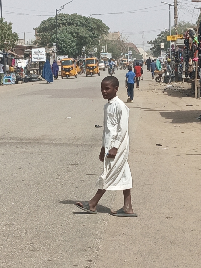 This image depicts a street scene in Hotoro North, Nigeria, under bright, possibly hazy, daylight conditions, indicated by clear shadows. The primary subject is a young boy, approximately 7-10 years old, centered in the foreground, walking from left to right across a two-lane asphalt road. He wears a long-sleeved, off-white traditional garment and dark flip-flops, looking slightly to his left. The road, showing signs of wear and minor debris, forms the central axis of the scene. In the midground, multiple yellow tricycle auto-rickshaws (Keke Napep) are visible, with at least two prominent on the left side of the road, moving away from the viewer. Other vehicles, including a white car and motorcycles, are further down the street. Pedestrian traffic is evident on both sides of the road. On the left, two individuals dressed in full-length blue garments walk away from the camera. Several other pedestrians, including two boys (one in a blue shirt, one in a red shirt) and adults, are visible on the right side of the road, also walking away. The environment comprises commercial or mixed-use buildings lining both sides of the street. On the left, signs are partially visible, including "SAHARARAM" and "MARAIS." A large, dense green tree is prominent in the upper left quadrant. Utility poles with streetlights are interspersed along the road. On the right side, makeshift market stalls display various goods, including shoes, and the unpaved shoulder contains some debris. The sky above is bright and shows a slight haze.