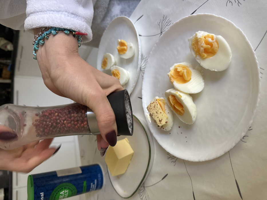 A close-up, eye-level shot depicts a person's hands seasoning food in a domestic kitchen in Yerevan, Armenia. The primary action shows a clear pepper grinder filled with pink peppercorns being operated over a white plate containing three halves of hard-boiled eggs. One egg half is already topped with a piece of yellow cheese and dark seasoning. A second white plate in the background holds three additional hard-boiled egg halves. To the left, a small, round white plate with a green rim holds a block of yellow butter. A blue container labeled "SEA SALT" is partially visible behind the butter. The person's right hand, wearing a turquoise beaded bracelet and a chain bracelet, is partially covered by a white terry cloth robe sleeve. Both hands have dark-painted fingernails. The food is arranged on a white tablecloth with a subtle dandelion pattern, and blurred white kitchen cabinets are visible in the background.
