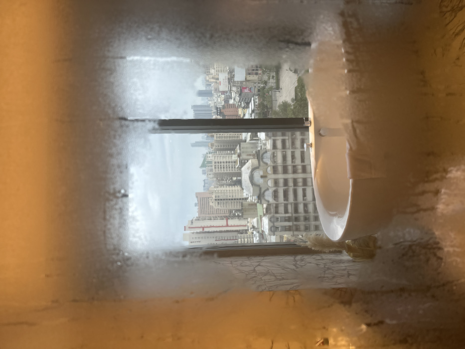 A blurry, moisture-obscured view reveals a city skyline through a tall window