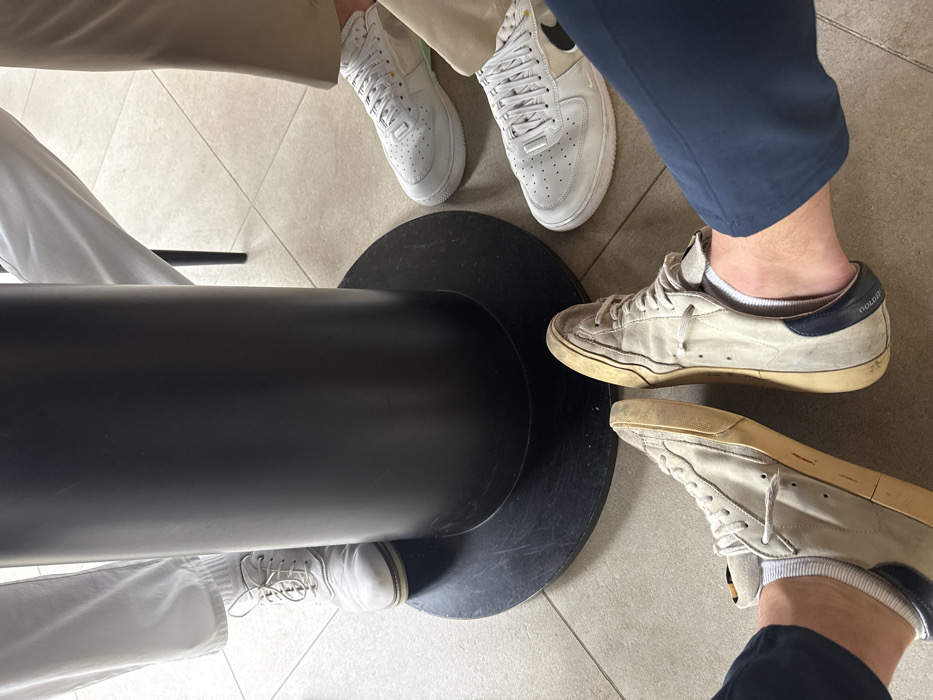 The photo shows the feet of three people around a black table base. Two people wear white sneakers; one is a newer style, the other appears worn. The third person sports dirty white sneakers, with navy blue heels and beige soles, and is wearing short socks. The floor is tiled and off-white. The lighting is bright.