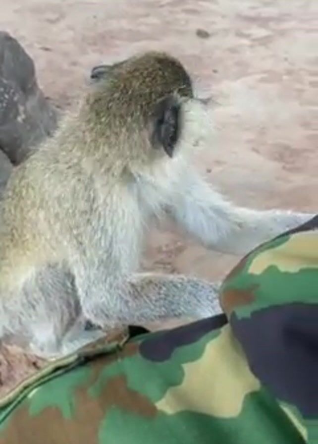 A medium shot shows a grey-green vervet monkey seated on the ground next to the roots of a tree. The monkey is partly touching a person’s leg, which is covered in camouflage fabric. The ground is a light brown, sandy color. The monkey has black ears, a black face, white fur on its hands, and large white eyebrow hairs.