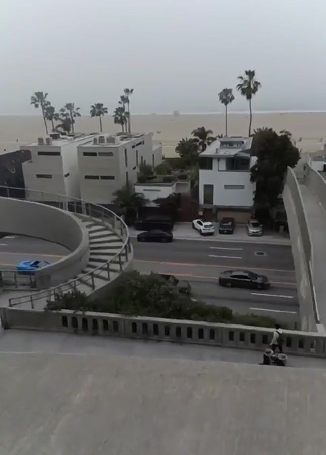 The camera pans across an outdoor scene. It appears to be a coastal area with a road and a pedestrian bridge crossing it. The bridge is constructed of concrete. The beach can be seen in the background, beyond some buildings. Palm trees are also visible, contributing to the beachy vibe of the scene. On the road below, cars can be seen moving in both directions. Several people can be seen walking on the overpass where the camera is placed. The sky is overcast and somewhat gray, suggesting a cloudy day.