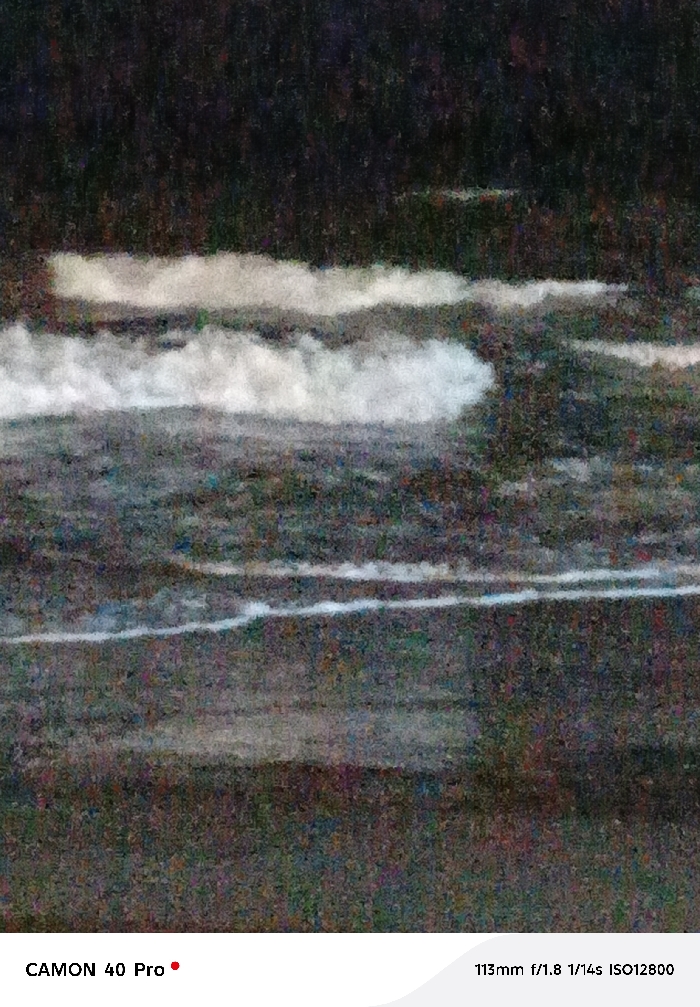 A grainy, low-light image depicts waves crashing on a beach at night. The dark sky and background contrast with the white foam of the waves. Several streaks of white likely represent the surf line in the water. The image includes camera information at the bottom. The parameters indicate a high ISO setting and a fast lens, reflecting the low-light conditions.