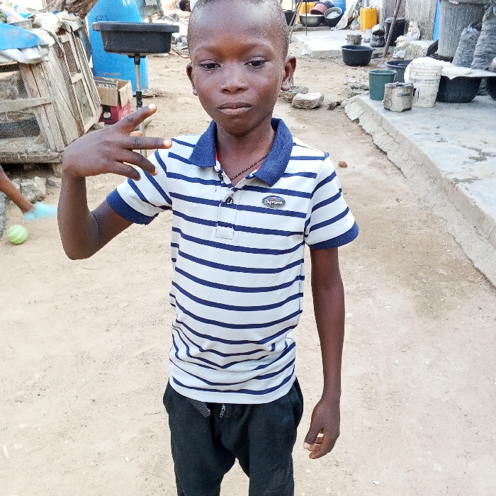 A young boy stands in a sandy area. He wears a striped white and blue polo shirt with black pants. His left hand is raised, making a gesture with his fingers. Behind him, there is a mix of objects including a blue barrel, some pots, and building materials. A glimpse of another person's foot and a watermelon is visible in the background. The environment suggests an outdoor space, possibly near a construction site or a residential area with scattered objects.