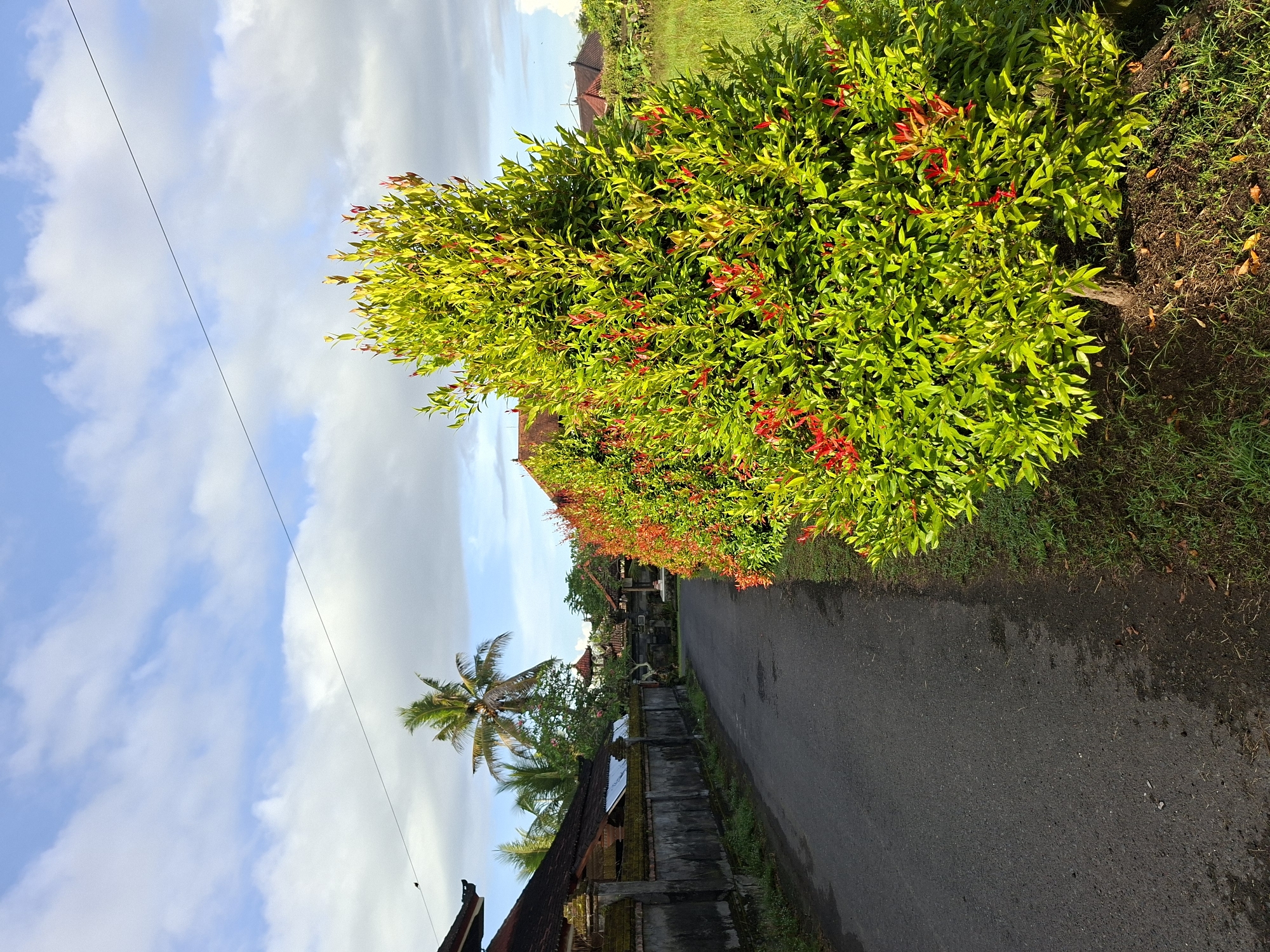 The image depicts a street scene in Lodtunduh, Indonesia. A paved road stretches into the distance, flanked on one side by a lush, green hedge with red flowers. On the other side of the road, there's a low stone wall, behind which are buildings with traditional Balinese architecture. A palm tree is visible rising above the buildings. The sky is partly cloudy.