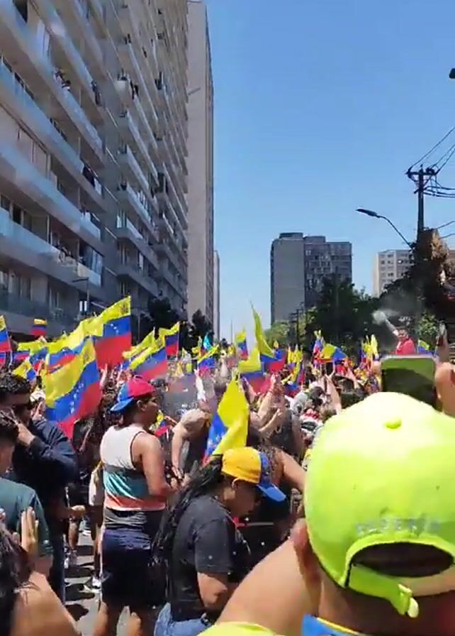 A crowd of people on a city street is waving Venezuelan flags