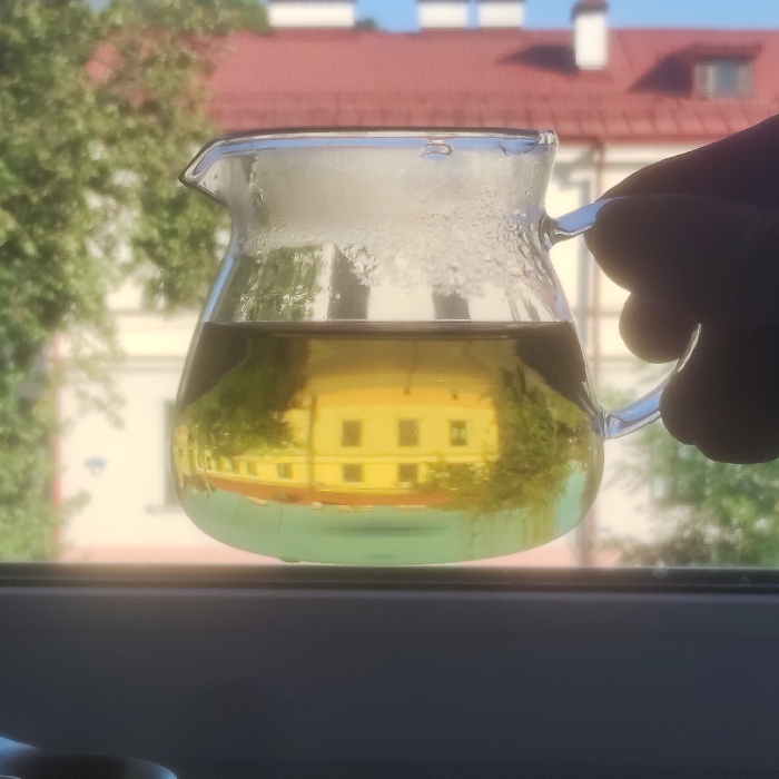 A hand with dark skin holds a clear, heat-misted glass teapot, partially filled with a yellowish-green liquid, likely tea. The teapot features a small spout and a handle, which the hand grasps. The object is positioned indoors, with the bottom edge of a dark window frame visible horizontally across the lower portion of the image. Reflected prominently within the liquid in the teapot is an inverted image of a distinct yellow, multi-story building with multiple rows of rectangular windows, framed by green tree foliage. This reflected building is identifiable as the Old Castle (Стары замак) in Hrodna, Belarus. The direct background, visible through and around the teapot, is an out-of-focus outdoor scene under a clear blue sky. It features the vibrant green canopy of trees on the left and a large building with a prominent red tiled roof, white walls, and visible gables/chimneys on the right. This architectural style is consistent with historical buildings in the vicinity of the Old and New Castles in Hrodna. The scene suggests a daytime view from an interior window overlooking the historical center of Hrodna, Belarus.