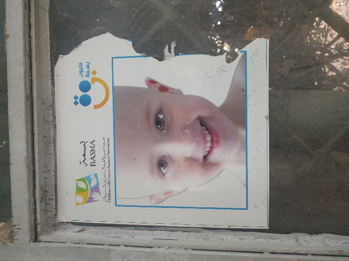 A printed poster, oriented vertically, is affixed to the interior surface of a windowpane in Ash-Shaghour Municipality, Syria. The poster features a prominent image of a young, bald child with light eyes and a slight smile, framed by a thin blue border. A small, clear drop is visible on the child's right lower eyelid. Above the child's image, the top left section displays the Arabic text "بسمة" (Basma) and the English text "BASMA," along with a logo depicting a sun or leaf design with overlapping colored hands, and the text "جمعية دعم الأطفال المصابين بالسرطان" (Children with Cancer Support Association). The top right section includes the Arabic text "مليون بسمة" (Million Basma) and a logo resembling a stylized blue smiley face. The poster exhibits wear, including a torn section on its right side, dirt, and faint, scribbled markings below the child's image. The window's frame, likely wood or painted metal, is visible along the left and top edges, showing signs of aging and wear. Through the window, a dark, blurry outdoor environment with indistinct shapes consistent with foliage or trees is visible, along with reflections on the glass surface.