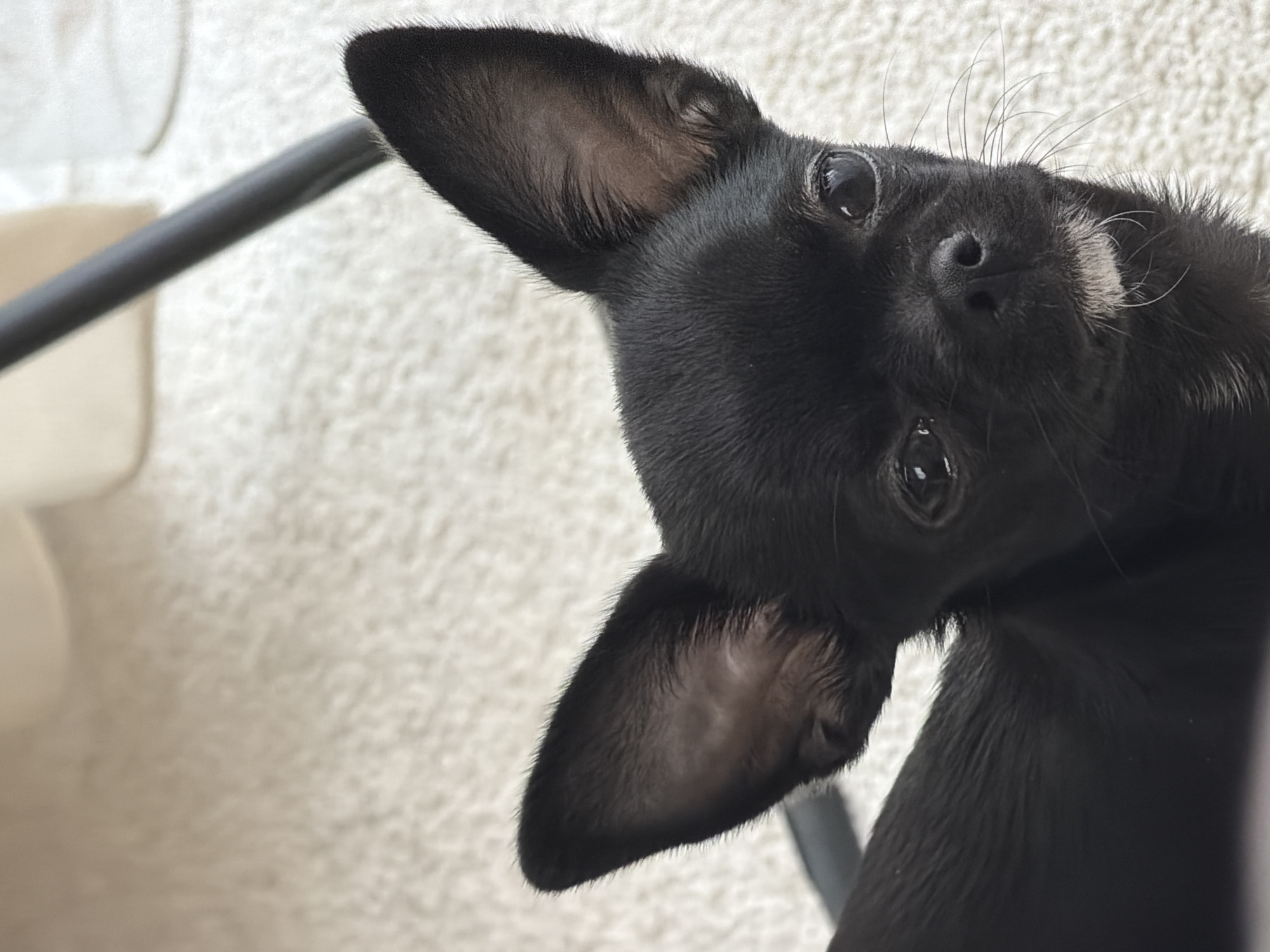 An indoor close-up photograph depicts a small, black canine, consistent with a Chihuahua, positioned in the lower-left to central frame, facing directly towards the viewer. The dog has large, erect ears, dark eyes, a black nose, and a small area of white fur visible on its chin and lower muzzle. Its coat appears short and sleek. The background consists of a light-colored, textured surface, indicative of a rug or carpet. In the upper background, blurry, light-toned shapes and a dark, angled linear object, possibly a furniture leg, are discernible. The specific geographical location in the city of Boreti, Montenegro, cannot be determined from the visual evidence presented within this image.