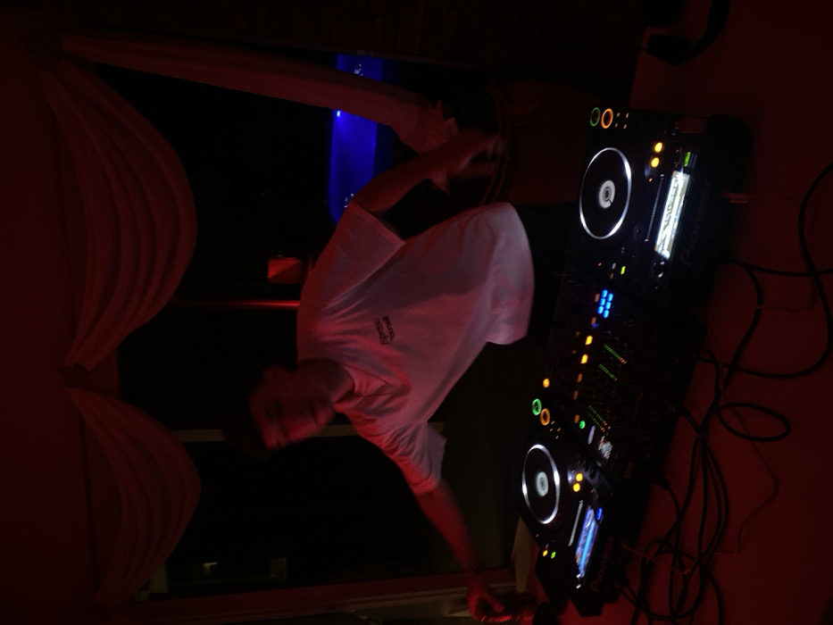 A DJ stands at a DJ controller, wearing a white t-shirt in a dimly lit room