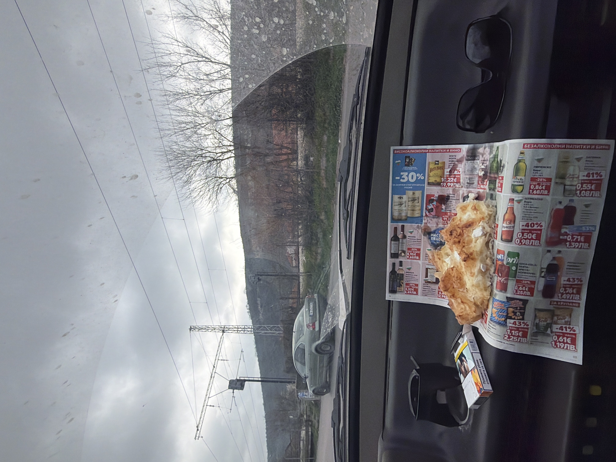 The image presents a first-person perspective from inside a vehicle, looking forward through a dirt-splattered windshield under an overcast sky. On the dashboard in the immediate foreground, a folded Bulgarian supermarket advertisement flyer, displaying prices in "лв." (Bulgarian Lev), serves as a surface. Resting on this flyer is a partially consumed, flaky pastry. To the left of the flyer, a pack of "Karelia Slims" cigarettes, bearing the Bulgarian health warning "Пушенето убива - откажете се сега" (Smoking kills - quit now), lies adjacent to a black cup holder or small storage compartment. To the right, a pair of black sunglasses is positioned on the dashboard. Outside the vehicle, a grey-green Volkswagen Passat B5 sedan, bearing the Bulgarian license plate "В 2529 ТХ," is visible on a paved road, positioned facing away from the viewer. The "В" prefix on the license plate confirms registration in Varna Province, where the city of Provadia, Bulgaria, is located. Beyond the road, active railway tracks with overhead electrification lines and supporting gantries are present, along with a railway signal post. The environment adjacent to the tracks features sparse, leafless trees and dry brush. In the background, a large, barren or sparsely vegetated hill or cliff face rises prominently against the uniform grey sky, consistent with the geography surrounding Provadia. The scene depicts a momentary pause in a semi-urban or rural setting within Provadia, Bulgaria, next to a railway line.