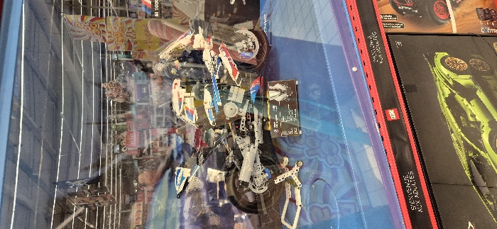 - "The image displays a detailed LEGO Technic model of a BMW M 1000 RR motorcycle, primarily white, blue, and red, showcased within a transparent display case" by FM-Grq9g2, licensed under CC BY 4.0