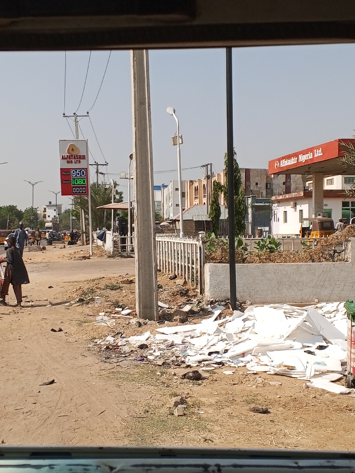 The image depicts an outdoor street scene in Tarauni, Nigeria, observed from within a vehicle. In the foreground, a substantial accumulation of white, broken material, consistent with styrofoam or insulation panels, mixed with general debris, occupies the dirt ground to the right of a large concrete utility pole. Adjacent to this refuse is a white, metal picket fence bordering a raised planter containing green foliage. Further right, a black streetlamp post stands before the Alfatashir Nigeria Ltd. gas station, which features a red canopy and signage. A yellow tricycle is parked near the gas station building. In the midground, to the left, two individuals are visible on a dirt path alongside a paved road. One person, dressed in a dark top and patterned trousers, walks away from the viewer. A prominent red and white Alfatashir Nigeria Ltd. sign displays fuel prices: "Petrol 950" and "Diesel 1080." Overhead, multiple power lines crisscross the frame. The background reveals various multi-story buildings of differing architectural styles and colors, under a clear, light blue sky. The general environment suggests a commercial or mixed-use urban area.