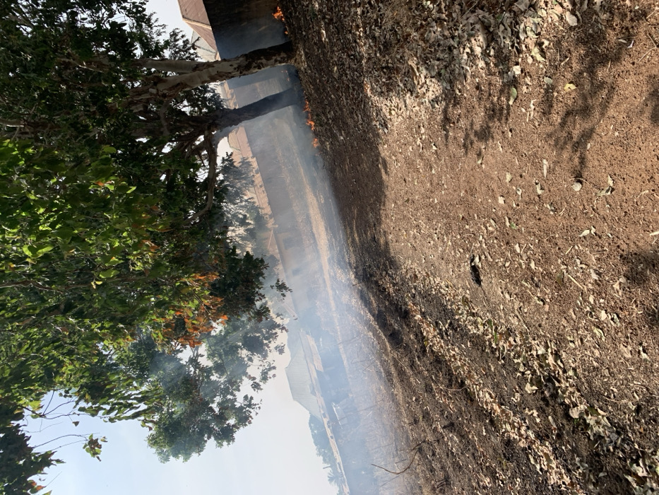 The image depicts an outdoor scene in Jos, Nigeria, characterized by active ground fires and smoke. The foreground features reddish-brown soil, with a dirt path running diagonally from the bottom-center towards the upper-left. Dry leaves are scattered across the path and surrounding ground. To the left of the path, the ground exhibits extensive areas of blackened, burnt vegetation, from which white and grey smoke emanates and spreads horizontally across the middle ground. Multiple small, isolated flames are visible on the ground along the right side of the image, near the base of a tree trunk and a light-colored wall. Two large trees with green foliage are prominent in the upper half of the frame, casting shadows on the path. In the background, behind the smoke, several low-rise buildings with light-colored walls and dark roofs are partially discernible. The sky above is clear and light blue, indicating daylight. No individuals are present.
