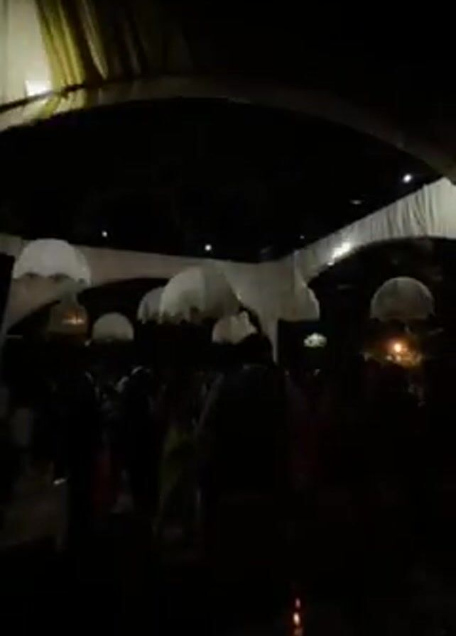 A dimly lit outdoor event features guests standing and talking, possibly mingling after a meal, with tables set for dining visible in the foreground. Overhead, white fabric structures are illuminated, suggesting a covered area. The overall atmosphere is festive, likely a wedding or celebration.